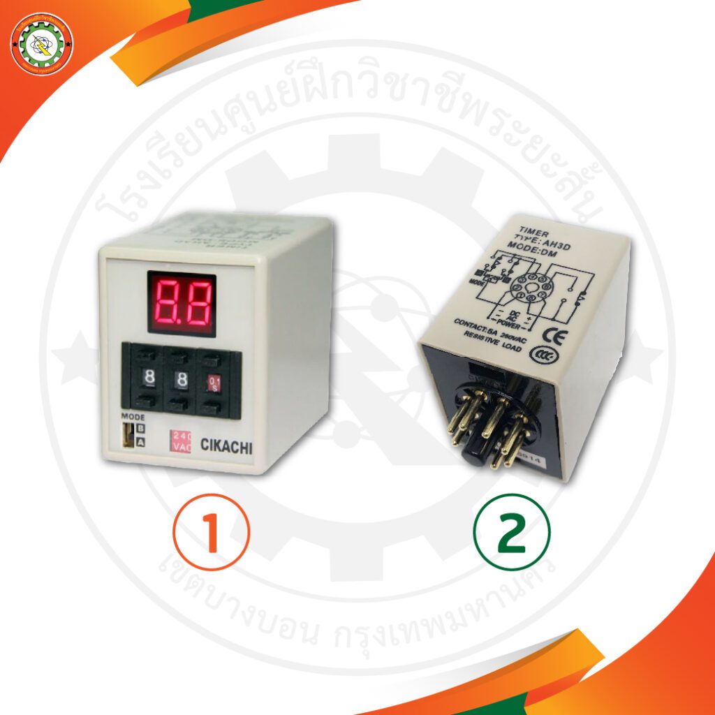 DIGITAL TIMER คืออะไร?Mode A กับ B ใช้ต่างกันอย่างไร? ไทม์เมอร์แบบดิจิทัล (Digital Timer) เป็นอุปกรณ์อิเล็กทรอนิกส์ชนิดหนึ่งที่ถูกนำมาใช้เป็นอุปกรณ์ชี้นำ(pilot device)ในระบบควบคุมแบบอัติโนมัติ(Automation Systems) เพื่อใช้ในการควบคุมหรือตั้งเวลาการทำงานของเครื่องจักรหรือกระบวนการผลิตต่าง ๆในงานอุตสาหกรรม เช่นตั้งไทม์เมอร์ในการควบคุมระยะเวลาในการทำงานของมอเตอร์ตั้งเวลาในการสตาร์ทและหยุดมอเตอร์เป็นต้น เพื่อให้สามารถนำไทม์เมอร์แบบดิจิทัลมาต่อใช้งานได้อย่างถูกต้องและปลอดภัยและสามารใช้งานได้อย่างหลายหลายจำเป็นอย่างยิ่งที่ต้องทราบหลักการทำงานของ MODE A-B หมายเลข 1คือ toggle switchเพื่อเลือก mode การทำงานให้เป็น MODE A หรือ MODE B หมายเลข 2คือ ไดอะแกรมแสดงความสัมพันธ์ของ MODE A หรือ MODE Bกับหน้าสัมผัสของ TIMER DIGITAL TIMER TYPE : AH3D-DMประกอบด้วยหน้าสัมผัสใช้งาน 4 สัมผัสคือหน้าสัมผัส 1-3 (NO)หน้าสัมผัส 1-4 (NC)หน้าสัมผัส 8-5 (NC)หน้าสัมผัส 8-6 (NO) การทำงานใน MODE Aเมื่อจ่ายไฟเลี้ยงเข้าที่ขา 2 และ 7 ของ TIMERเมื่อ TIMER นับถึงเวลาที่ตั้งไว้หน้าสัมผัสทั้ง 4จะเปลี่ยนเป็นสถานะตรงข้ามคือหน้าสัมผัส 1-3 (NO) จะต่อถึงกันหน้าสัมผัส 1-4 (NC) จะแยกออกจากกันหน้าสัมผัส 8-5 (NC) จะแยกออกจากกันหน้าสัมผัส 8-6 (NO) จะต่อถึงกันหน้าสัมผัสทั้ง 4จะคืนสถานะเมื่อตัดไฟเลี้ยงที่ขา 2 และ 7 ของ TIMER การทำงานใน MODE Bเมื่อจ่ายไฟเลี้ยงเข้าที่ขา 2 และ 7 ของ TIMERเมื่อ TIMER เริ่มนับหน้าสัมผัส 2 ชุดจะเปลี่ยนเป็นสถานะตรงข้ามทันทีจะไม่รอเวลาที่ตั้งไว้คือหน้าสัมผัส 1-3 (NO) จะต่อถึงกันหน้าสัมผัส 1-4 (NC) จะแยกออกจากกันเมื่อ TIMER นับถึงเวลาที่ตั้งไว้หน้าสัมผัสอีก 2 ชุดจะเปลี่ยนเป็นสถานะตรงข้ามคือหน้าสัมผัส 8-5 (NC) จะแยกออกจากกันหน้าสัมผัส 8-6 (NO) จะต่อถึงกันหน้าสัมผัสทั้ง 4จะคืนสถานะเมื่อตัดไฟเลี้ยงที่ขา 2 และ 7 ของ TIMER *หมายเหตุ*MODE B หน้าสัมผัส 1-3 และ 1-4จะทำหน้าที่เหมือน Relayไม่สามารถหน่วยเวลาได้ รับชม VDO อธิบายโหมดการทำงาน Timer Control ท่านไหน สนใจ เรียนหลักสูตรช่างไฟฟ้าคอนโทรลกับทางโรงเรียนสามารถโทรเข้ามา ได้ที่เบอร์ 081-407-6084 โรงเรียนศูนย์ฝึกวิชาชีพระยะสั้น ควบคุมโดย กระทรวงศึกษาธิการและ ได้รับอนุญาตจากกระทรวงแรงงานเป็นศูนย์ทดสอบมาตรฐานฝีมือแรงงานเรียนที่เรา” รู้จริง ทำได้จริง ปฏิบัติได้จริง ”